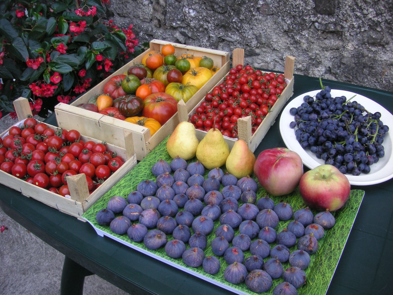 - Légumes de saison (tomates, salade verte…), tarte à la courgette ou à l’oignon…